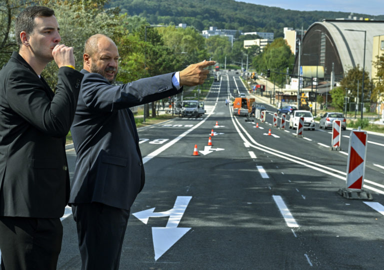 Zľava: Poslanec MsZ za MČ Dúbravka Dávid Dej a starosta mestskej časti Dúbravka Martin Zaťovič počas tlačovej konferencie k odovzdaniu novej štvorprúdovky na Harmincovej ulici v Bratislave. Bratislava 13. september 2023. Foto: SITA/Milan Illík