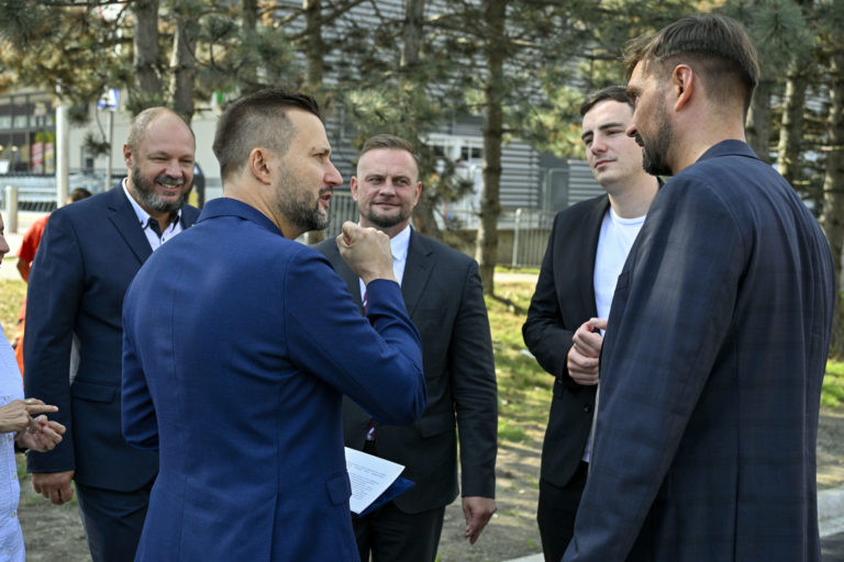 Zľava: Starosta mestskej časti Dúbravka Martin Zaťovič, primátor Bratislavy Matúš Vallo, poslanci MsZ za MČ Dúbravka Juraj Káčer a Dávid Dej počas tlačovej konferencie k odovzdaniu novej štvorprúdovky na Harmincovej ulici v Bratislave. Bratislava 13. september 2023. Foto: SITA/Milan Illík