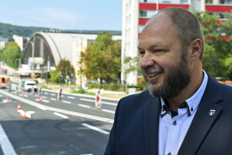 Starosta mestskej časti Dúbravka Martin Zaťovič počas tlačovej konferencie k odovzdaniu novej štvorprúdovky na Harmincovej ulici v Bratislave. Bratislava 13. september 2023. Foto: SITA/Milan Illík