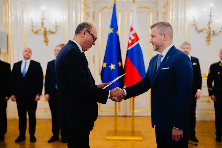 Uprostred sprava: Prezident SR Peter Pellegrini a nový nerezidentný mimoriadny a splnomocnený veľvyslanec Vladimir Adolfo Franco Sousa v Panamskej republike počas prijatia poverovacích listín piatich nerezidentných mimoriadnych a splnomocnených veľvyslancov v Prezidentskom paláci. Bratislava, 3. február 2026. Foto: SITA/Kancelária prezidenta SR