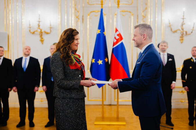 Uprostred sprava: Prezident SR Peter Pellegrini a nová nerezidentná mimoriadna a splnomocnená veľvyslankyňa v Lotyšskej republike Ingrīda Levrence počas prijatia poverovacích listín piatich nerezidentných mimoriadnych a splnomocnených veľvyslancov v Prezidentskom paláci. Bratislava, 3. február 2026. Foto: SITA/Kancelária prezidenta SR