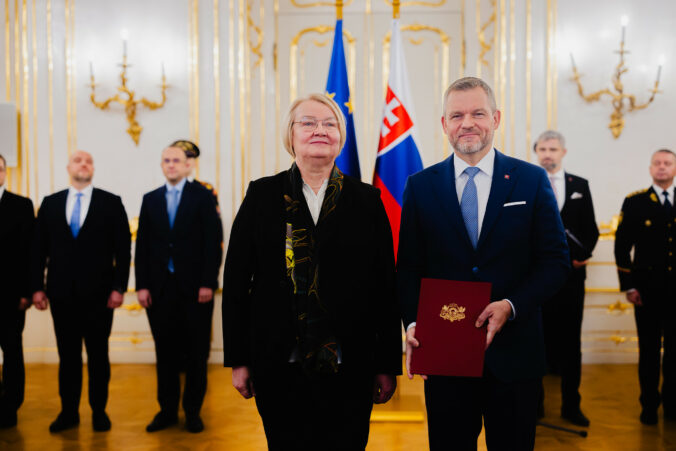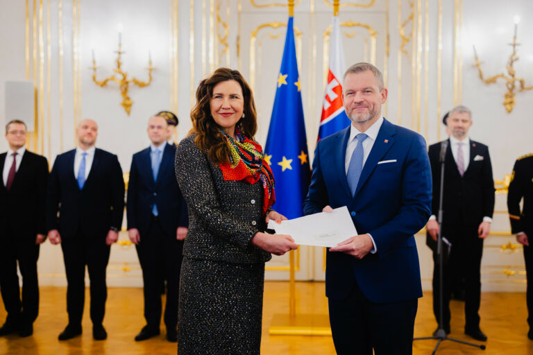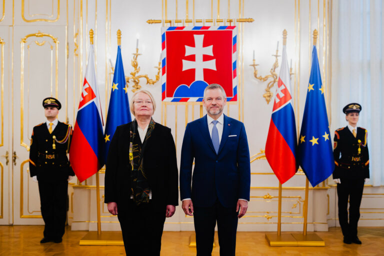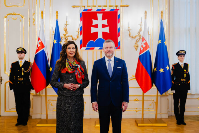 V popredí sprava: Prezident SR Peter Pellegrini a nová nerezidentná mimoriadna a splnomocnená veľvyslankyňa v Lotyšskej republike Ingrīda Levrence počas prijatia poverovacích listín piatich nerezidentných mimoriadnych a splnomocnených veľvyslancov v Prezidentskom paláci. Bratislava, 3. február 2026. Foto: SITA/Kancelária prezidenta SR