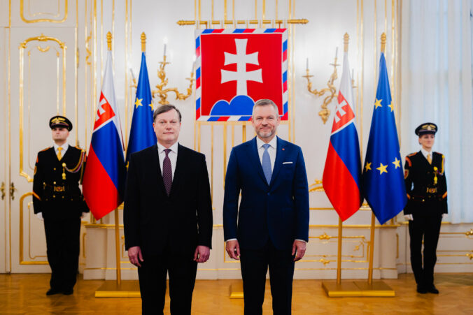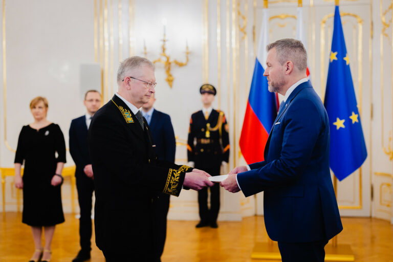 Uprostred sprava: Prezident SR Peter Pellegrini a nový nerezidentný mimoriadny a splnomocnený veľvyslanec Estónskej republiky Arti Hilpus počas prijatia poverovacích listín piatich nerezidentných mimoriadnych a splnomocnených veľvyslancov v Prezidentskom paláci. Bratislava, 3. február 2026. Foto: SITA/Kancelária prezidenta SR