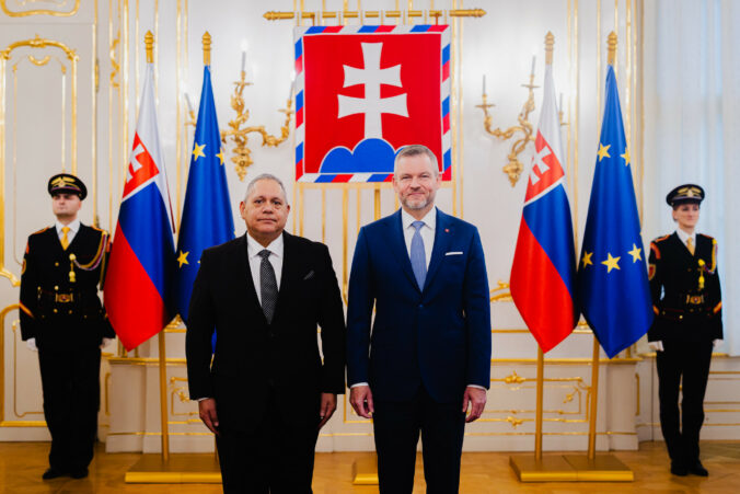 Sprava: Prezident SR Peter Pellegrini a nový nerezidentný mimoriadny a splnomocnený veľvyslanec Vladimir Adolfo Franco Sousa v Panamskej republike počas prijatia poverovacích listín piatich nerezidentných mimoriadnych a splnomocnených veľvyslancov v Prezidentskom paláci. Bratislava, 3. február 2026. Foto: SITA/Kancelária prezidenta SR
