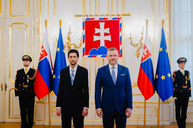 Sprava v popredí: Prezident SR Peter Pellegrini a nový izraelský veľvyslanec na Slovensku Jacob Yanovsky počas prijatia poverovacích listín od mimoriadneho a splnomocneného veľvyslanca Izraelského štátu v SR prezidentom SR v Prezidentskom paláci. Bratislava, 3. február 2026. Foto: SITA/Kancelária prezidenta SR