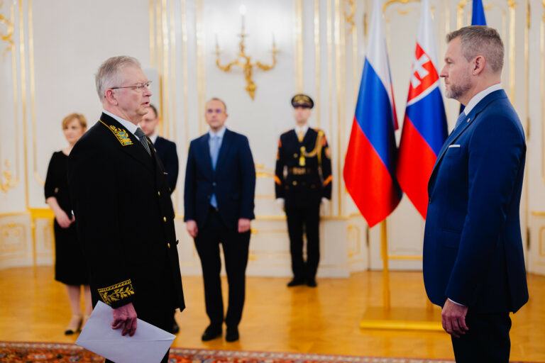 V popredí sprava: Prezident SR Peter Pellegrini a nový nerezidentný mimoriadny a splnomocnený veľvyslanec Estónskej republiky Arti Hilpus počas prijatia poverovacích listín piatich nerezidentných mimoriadnych a splnomocnených veľvyslancov v Prezidentskom paláci. Bratislava, 3. február 2026. Foto: SITA/Kancelária prezidenta SR