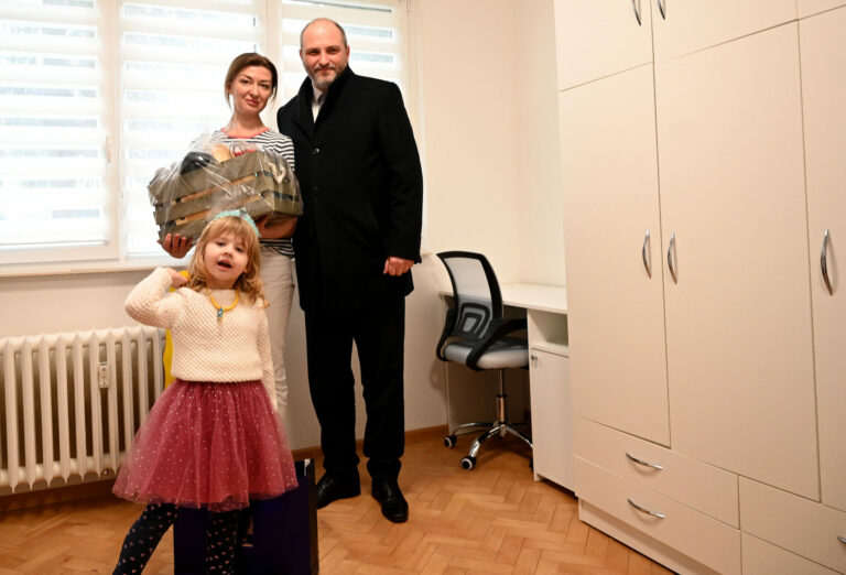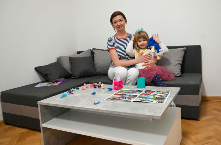 Zľava: Mamička Olena Ivakh s dcérkou Ninou počas odovzdania tretieho zo šiestich dostupných sociálnych nájomných bytov v Košiciach mame s dcérkou. Košice, 28. január 2025. Foto: SITA/Viktor Zamborský