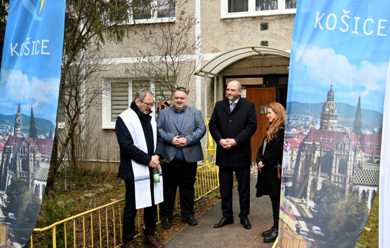 Zľava: Kňaz Peter Gombita, vedúci košickej pobočky Úsmev ako dar Radoslav Dráb, primátor Košíc Jaroslav Polaček a zástupkyňa spoločnosti Magna Justina De la Cruz počas odovzdania tretieho zo šiestich dostupných sociálnych nájomných bytov v Košiciach mame Olene Ivakh s dcérkou Ninou. Košice, 28. január 2025. Foto: SITA/Viktor Zamborský