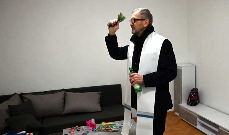 Kňaz Peter Gombita pri požehnaní tretieho zo šiestich dostupných sociálnych nájomných bytov v Košiciach počas odovzdania mame Olene Ivakh s dcérkou Ninou. Košice, 28. január 2025. Foto: SITA/Viktor Zamborský