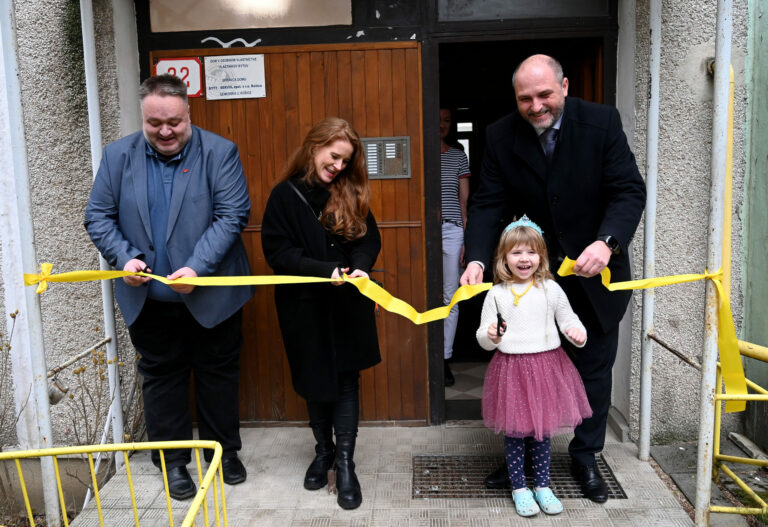 Zľava: Vedúci košickej pobočky Úsmev ako dar Radoslav Dráb, zástupkyňa spoločnosti Magna Justina De la Cruz, dcéra mami, ktorá dostala nájomný byt Nina a primátor Košíc Jaroslav Polaček počas prestrihnutia pásky v rámci odovzdania tretieho zo šiestich dostupných sociálnych nájomných bytov v Košiciach mame Olene Ivakh s dcérkou Ninou. Košice, 28. január 2025. Foto: SITA/Viktor Zamborský