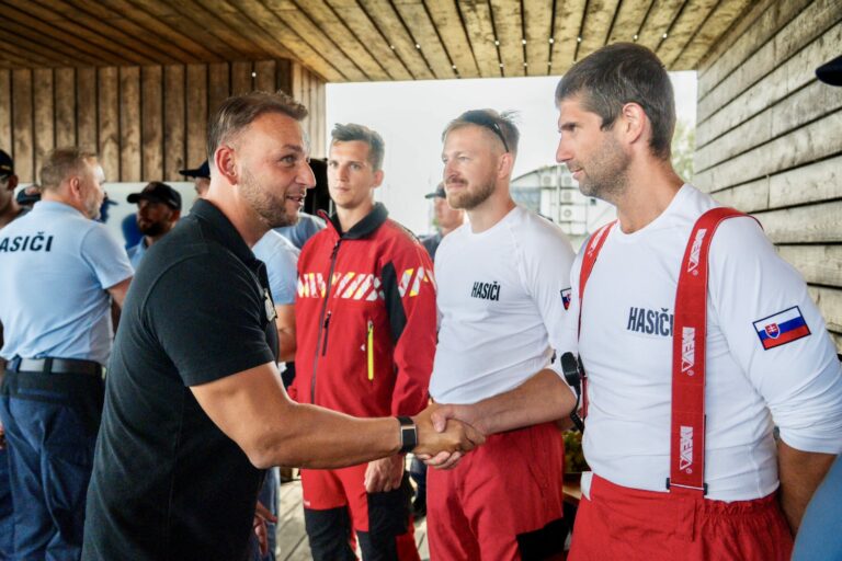 Minister vnútra SR Matúš Šutaj Eštok (uprostred) počas odovzdania novej špeciálnej hasičskej lode spojeného s ukážkami záchrany topiacich sa osôb a pátrania pod vodnou hladinou s použitím záchranných lávok a miniponoriek v Hrušovskej zdrži v Čunove. Bratislava, 24. júl 2025. Foto: SITA/MV SR