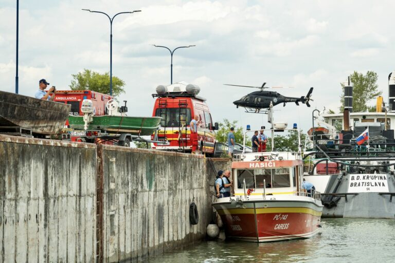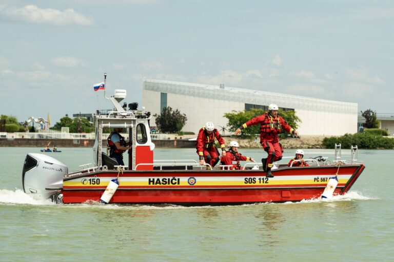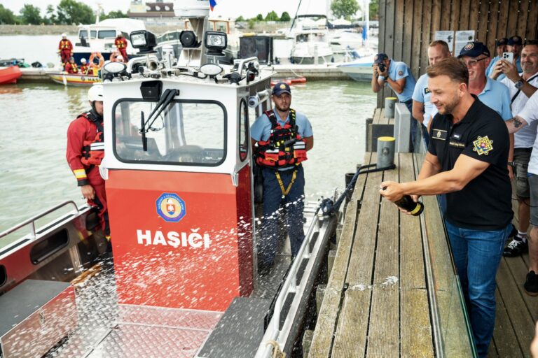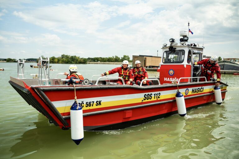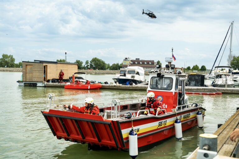 Odovzdanie novej špeciálnej hasičskej lode spojené s ukážkami záchrany topiacich sa osôb a pátraním pod vodnou hladinou s použitím záchranných lávok a miniponoriek v Hrušovskej zdrži v Čunove za účasti ministra vnútra SR. Bratislava, 24. júl 2025. Foto: SITA/MV SR