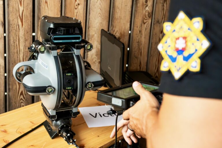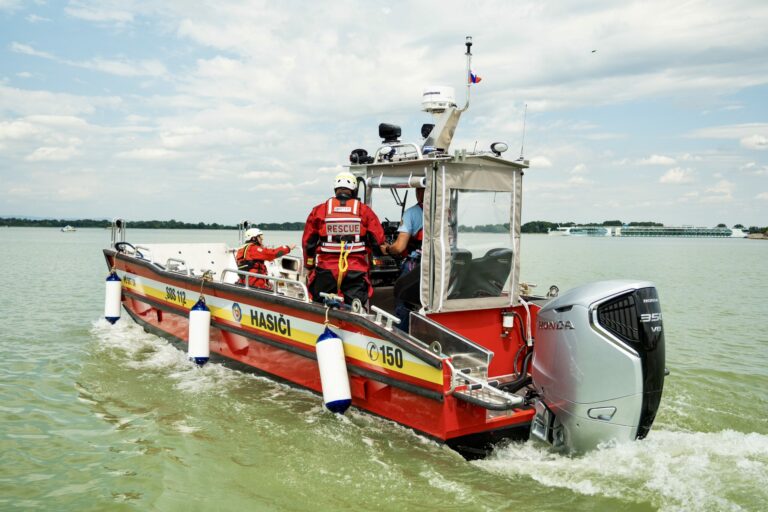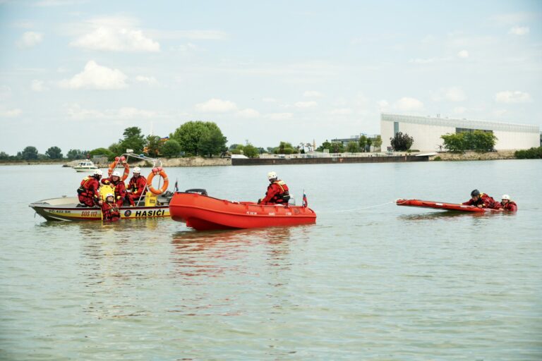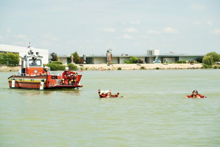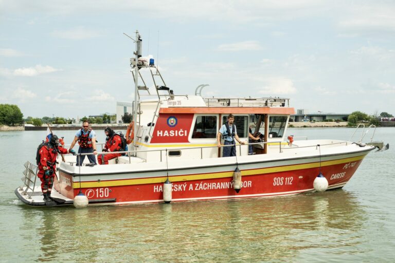 Ukážky záchrany topiacich sa osôb novou špeciálnou hasičskou loďou a pátranie pod vodnou hladinou s použitím záchranných lávok a miniponoriek v Hrušovskej zdrži v Čunove za účasti ministra vnútra SR. Bratislava, 24. júl 2025. Foto: SITA/MV SR
