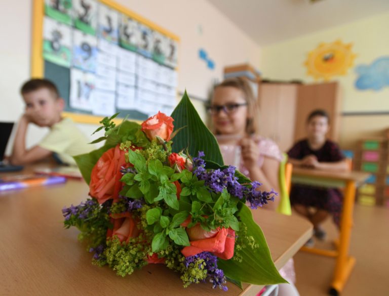 Kvety pre pani učiteľku v triede žiakov prvého ročníka 2019/2020 Alexandra Nedbálková (vľavo) počas odovzdávania koncoročných vysvedčení na Základnej škole v Starej Turej.