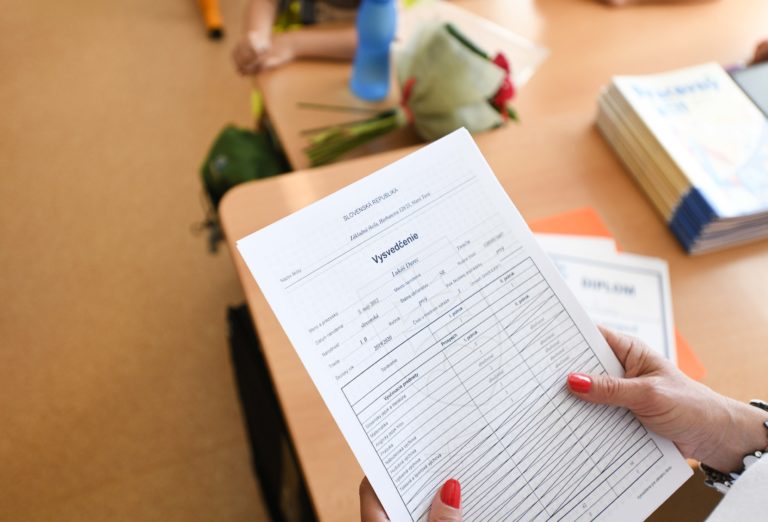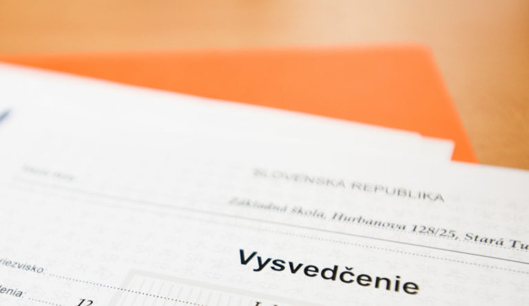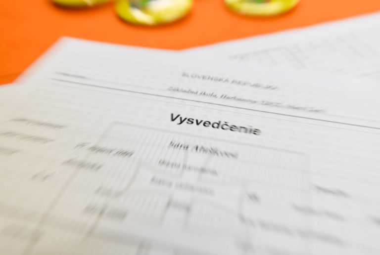 Pohľad na vysvedčenia žiakov v triede piateho ročníka počas odovzdávania koncoročných vysvedčení na Základnej škole v Starej Turej. Foto: SITA/Martin Medňanský