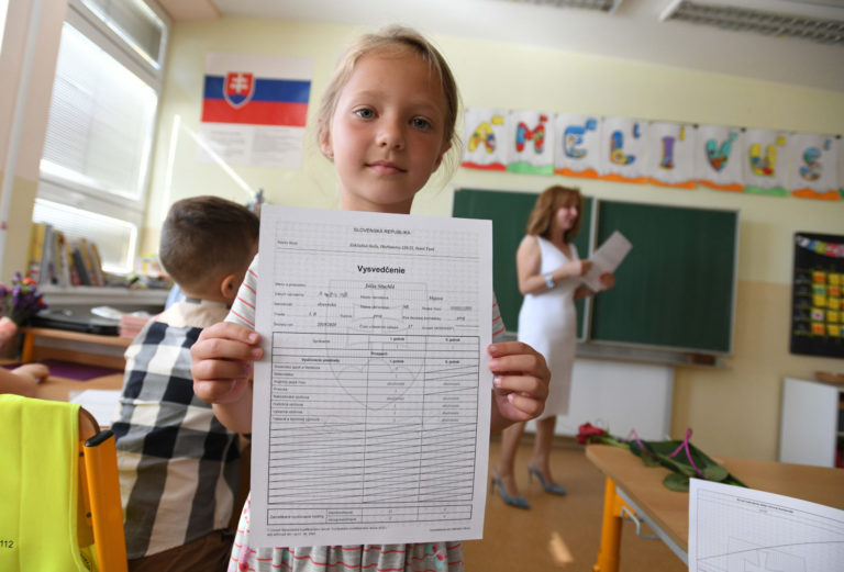 Žiačka prvého ročníka 2019/2020 s vysvedčením počas odovzdávania koncoročných vysvedčení na Základnej škole v Starej Turej. Foto: SITA/Martin Medňanský