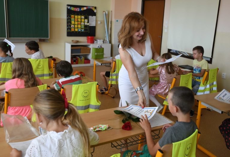 Triedna učiteľka žiakov prvého ročníka 2019/2020 Alexandra Nedbálková (uprostred) počas odovzdávania koncoročných vysvedčení na Základnej škole v Starej Turej. Foto: SITA/Martin Medňanský
