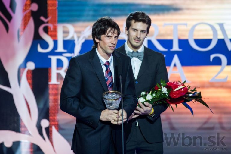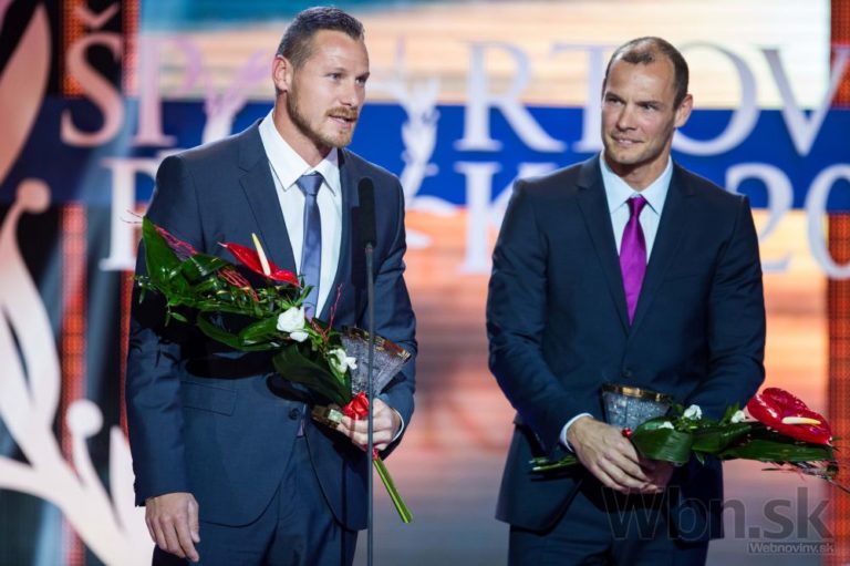 Zľava: Hliadka 3xC1 vodných lalomárov SR Alexander Slafvkovský a Matej Benuš (druhé miesto Kolektívy 2014) počas vyhlásenia výsledkov ankety Klubu športových redaktorov SSN Športovec roka 2014 na Slovensku. Bratislava, 22. december 2014. Foto: SITA/Jozef Jakubčo