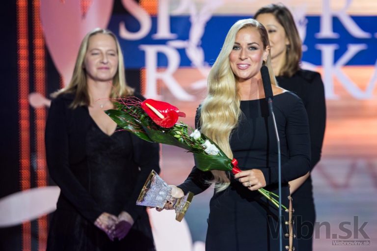 Slovenská tenistka Dominika Cibulková (vpravo) - tretie miesto jednotlivci 2014 - počas vyhlásenia výsledkov ankety Klubu športových redaktorov SSN Športovec roka 2014 na Slovensku. Bratislava, 22. december 2014. Foto: SITA/Jozef Jakubčo