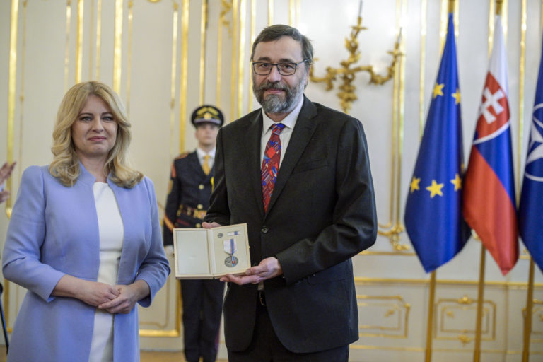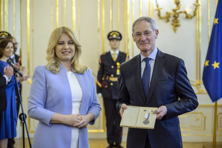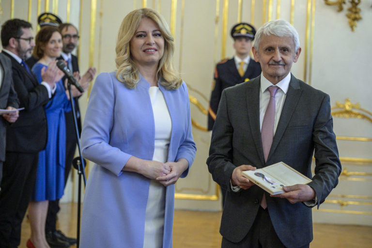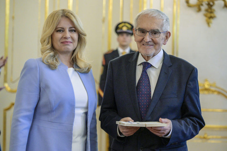 Zľava v popredí: Prezidentka SR Zuzana Čaputová a bývalý slovenský veľvyslanec v USA Martin Bútora počas odovzdávania ďakovných medailí v Prezidentskom paláci pri príležitosti 20. výročia vstupu SR do EÚ a NATO 28 osobnostiam, ktoré sa v období pred rokom 2004 priamo podieľali na prístupovom procese alebo iným spôsobom podporovali integračné úsilie SR. Bratislava, 30. apríl 2024. Foto: SITA/Milan Illík