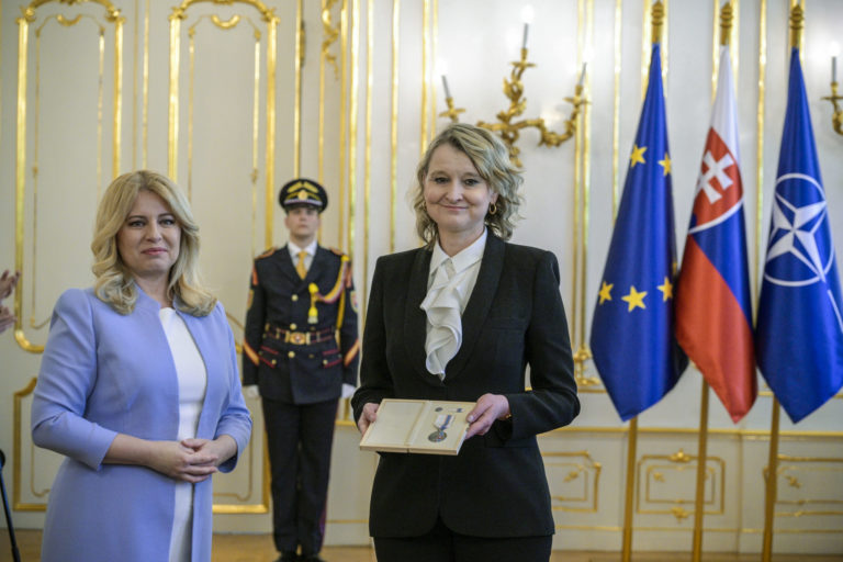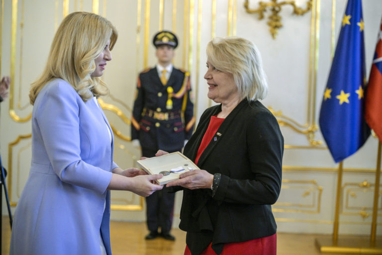 Prezidentka SR Zuzana Čaputová (vľavo) počas odovzdávania ďakovných medailí v Prezidentskom paláci pri príležitosti 20. výročia vstupu Slovenskej republiky do Európskej únie (EÚ) a Organizácia Severoatlantickej zmluvy NATO 28 osobnostiam, ktoré sa v období pred rokom 2004 priamo podieľali na prístupovom procese, alebo iným spôsobom podporovali integračné úsilie SR. Bratislava, 30. apríl 2024. Foto: SITA/Milan Illík