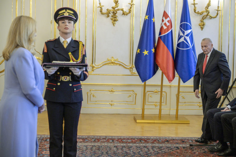 Zľava: Prezidentka SR Zuzana Čaputová a slovenský diplomat a politik Ivan Korčok počas odovzdávania ďakovných medailí v Prezidentskom paláci pri príležitosti 20. výročia vstupu Slovenskej republiky do Európskej únie (EÚ) a Organizácia Severoatlantickej zmluvy NATO 28 osobnostiam, ktoré sa v období pred rokom 2004 priamo podieľali na prístupovom procese, alebo iným spôsobom podporovali integračné úsilie SR. Bratislava, 30. apríl 2024. Foto: SITA/Milan Illík