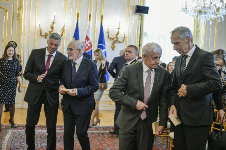 Sprava v popredí: Ján Figeľ, Mikuláš Dzurinda, bývalý slovenský veľvyslanec v USA Martin Bútora a bývalý predseda parlamentu Béla Bugár počas odovzdávania ďakovných medailí v Prezidentskom paláci pri príležitosti 20. výročia vstupu Slovenskej republiky do Európskej únie (EÚ) a Organizácia Severoatlantickej zmluvy NATO 28 osobnostiam, ktoré sa v období pred rokom 2004 priamo podieľali na prístupovom procese, alebo iným spôsobom podporovali integračné úsilie SR. Bratislava, 30. apríl 2024. Foto: SITA/Milan Illík