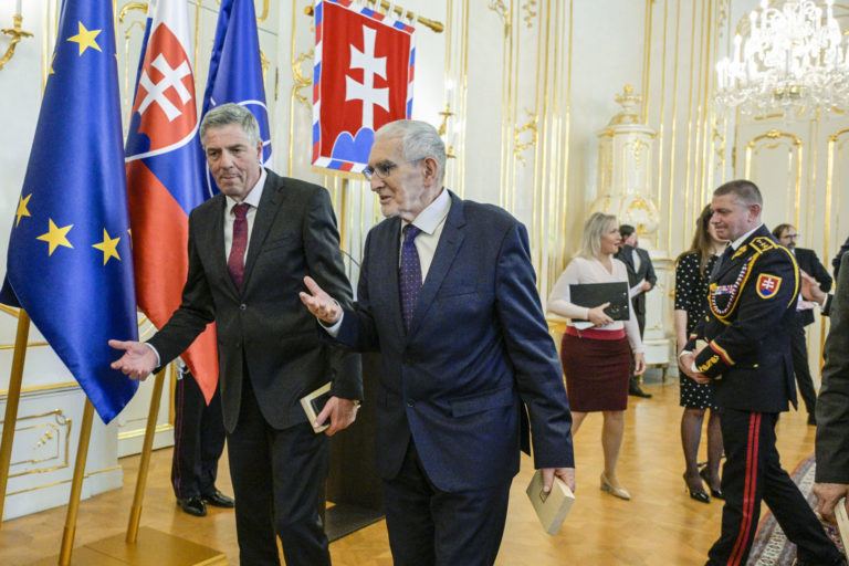 Zľava: Bývalý predseda Národnej rady SR Béla Bugár a bývalý slovenský veľvyslanec v USA Martin Bútora počas odovzdávania ďakovných medailí v Prezidentskom paláci pri príležitosti 20. výročia vstupu Slovenskej republiky do Európskej únie (EÚ) a Organizácia Severoatlantickej zmluvy NATO 28 osobnostiam, ktoré sa v období pred rokom 2004 priamo podieľali na prístupovom procese, alebo iným spôsobom podporovali integračné úsilie SR. Bratislava, 30. apríl 2024. Foto: SITA/Milan Illík