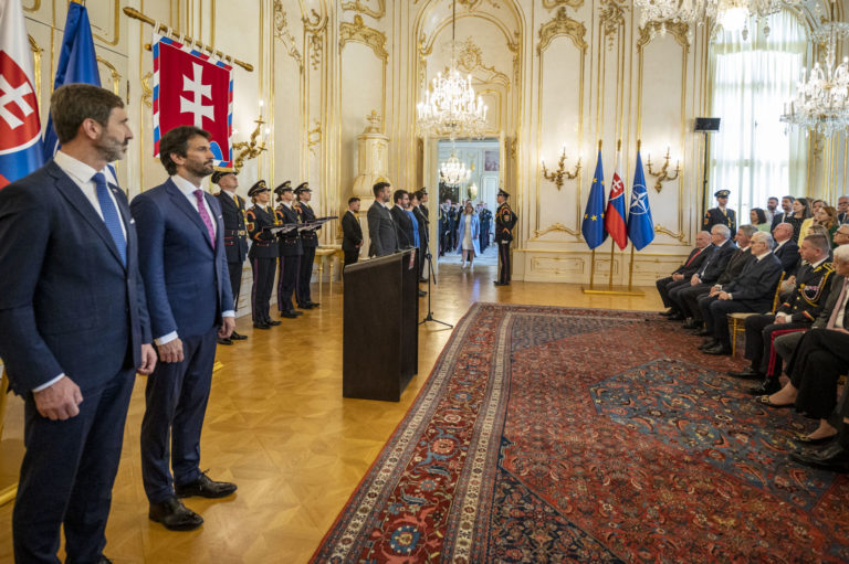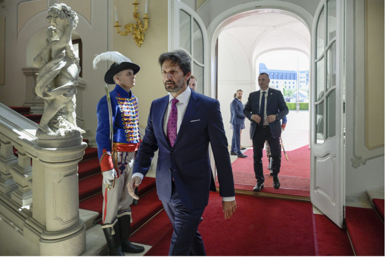 Slovenský diplomat a politik Ivan Korčok (uprostred) počas odovzdávania ďakovných medailí v Prezidentskom paláci pri príležitosti 20. výročia vstupu Slovenskej republiky do Európskej únie (EÚ) a Organizácia Severoatlantickej zmluvy NATO 28 osobnostiam, ktoré sa v období pred rokom 2004 priamo podieľali na prístupovom procese, alebo iným spôsobom podporovali integračné úsilie SR. Bratislava, 30. apríl 2024. Foto: SITA/Milan Illík