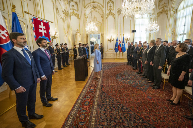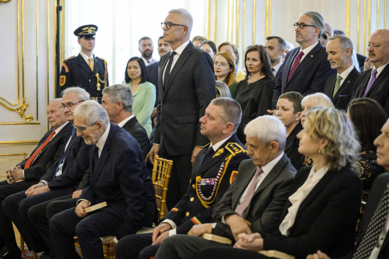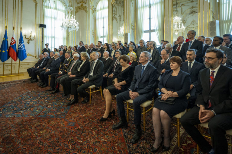 Atmosféra počas odovzdávania ďakovných medailí v Prezidentskom paláci pri príležitosti 20. výročia vstupu Slovenskej republiky do Európskej únie (EÚ) a Organizácia Severoatlantickej zmluvy NATO 28 osobnostiam, ktoré sa v období pred rokom 2004 priamo podieľali na prístupovom procese, alebo iným spôsobom podporovali integračné úsilie SR. Bratislava, 30. apríl 2024. Foto: SITA/Milan Illík