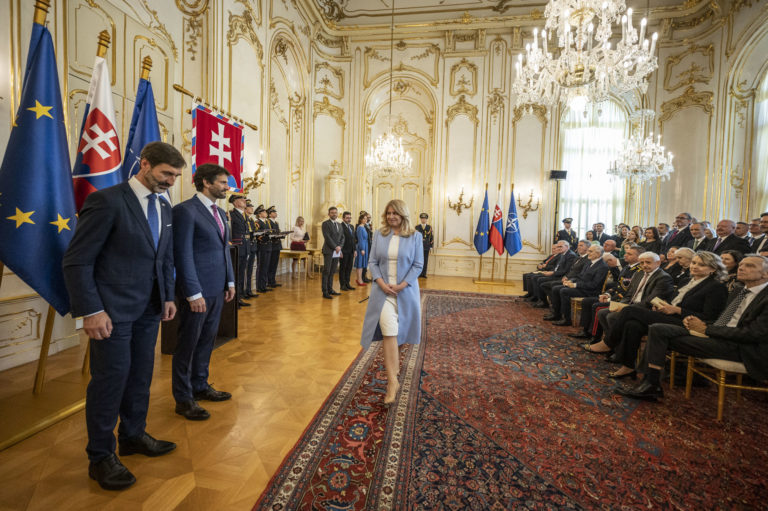 Zľava v popredí: Minister zahraničných vecí a európskych záležitostí SR Juraj Blanár, minister vnútra SR Róbert Kaliňák a prezidentka Zuzana Čaputová počas odovzdávania ďakovných medailí v Prezidentskom paláci pri príležitosti 20. výročia vstupu Slovenskej republiky do Európskej únie (EÚ) a Organizácia Severoatlantickej zmluvy NATO 28 osobnostiam, ktoré sa v období pred rokom 2004 priamo podieľali na prístupovom procese, alebo iným spôsobom podporovali integračné úsilie SR. Bratislava, 30. apríl 2024. Foto: SITA/Milan Illík