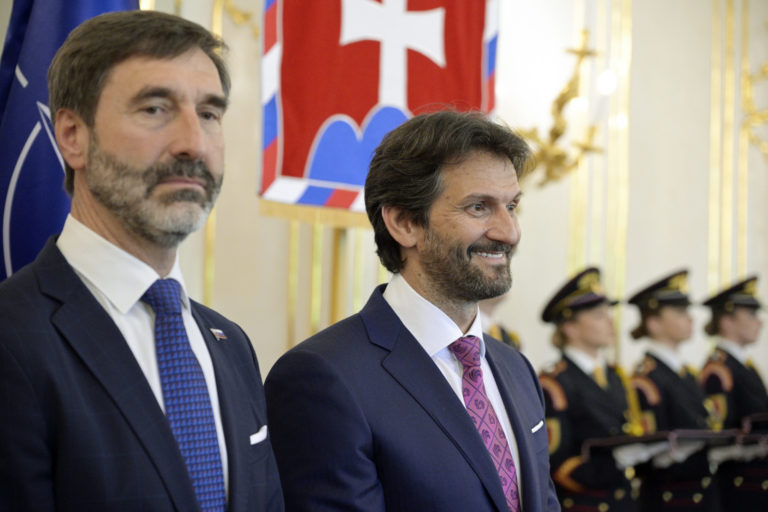 Zľava: Minister zahraničných vecí a európskych záležitostí SR Juraj Blanár a minister vnútra SR Róbert Kaliňák počas odovzdávania ďakovných medailí v Prezidentskom paláci pri príležitosti 20. výročia vstupu Slovenskej republiky do Európskej únie (EÚ) a Organizácia Severoatlantickej zmluvy NATO 28 osobnostiam, ktoré sa v období pred rokom 2004 priamo podieľali na prístupovom procese, alebo iným spôsobom podporovali integračné úsilie SR. Bratislava, 30. apríl 2024. Foto: SITA/Milan Illík