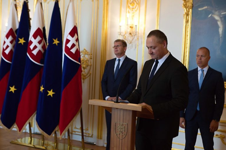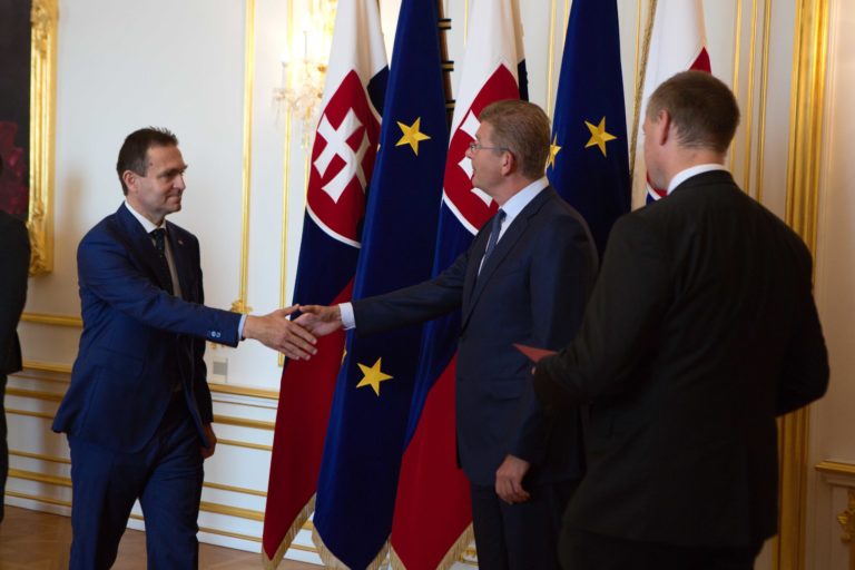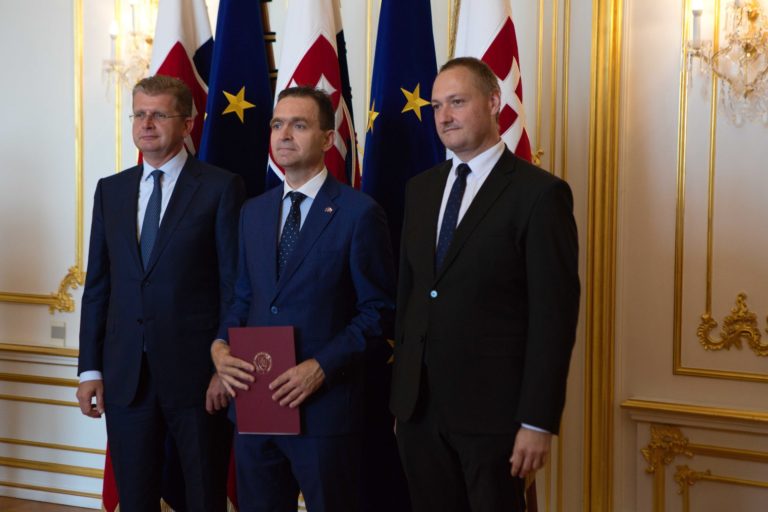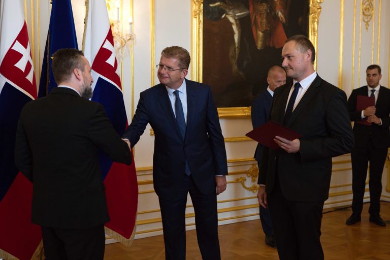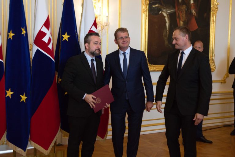 Zľava: Podpredseda parlamentu, poverený vedením predsedu NR SR Peter Žiga, europoslanec za Progresívne Slovensko Ľudovít Ódor a predseda Štátnej komisie pre voľby a kontrolu financovania politických strán Eduard Burda počas odovzdávania osvedčení o zvolení novým poslancom Európskeho parlamentu na Bratislavskom hrade. Bratislava, 18. jún 2024. Foto: SITA/Tomáš Susko