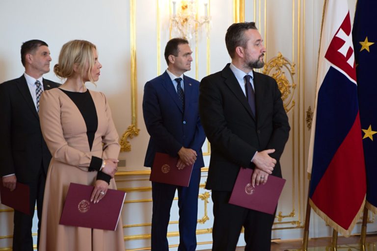 Zľava: Zvolení euroúposlanci za Progresívne Slovensko Ľudovít Ódor a Lucia Yar, podpredseda parlamentu Peter Žiga a predseda Štátnej komisie pre voľby a kontrolu financovania politických strán Eduard Burda počas odovzdávania osvedčení o zvolení novým poslancom Európskeho parlamentu na Bratislavskom hrade. Bratislava, 18. jún 2024. Foto: SITA/Tomáš Susko