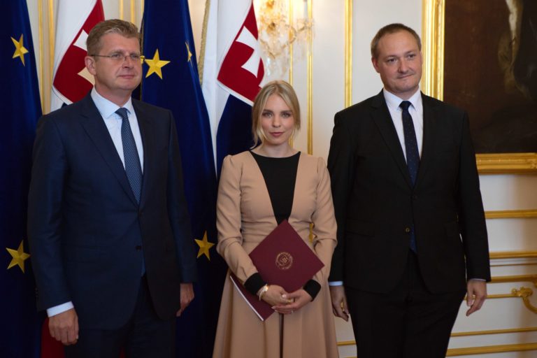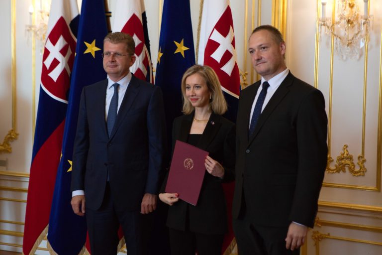 Zľava: Podpredseda parlamentu Peter Žiga zvolená europoslankyňa za Progresívne Slovensko Lucia Yar a predseda Štátnej komisie pre voľby a kontrolu financovania politických strán Eduard Burda počas odovzdávania osvedčení o zvolení novým poslancom Európskeho parlamentu na Bratislavskom hrade. Bratislava, 18. jún 2024. Foto: SITA/Tomáš Susko