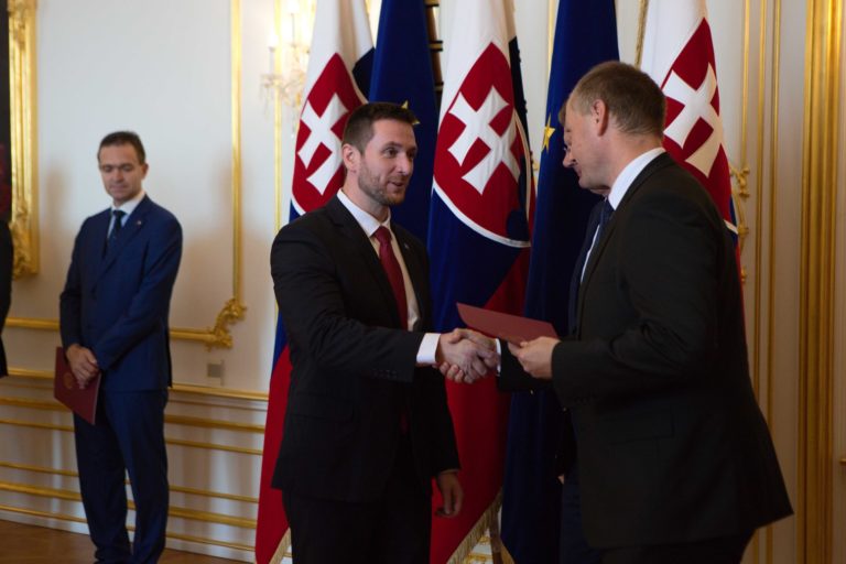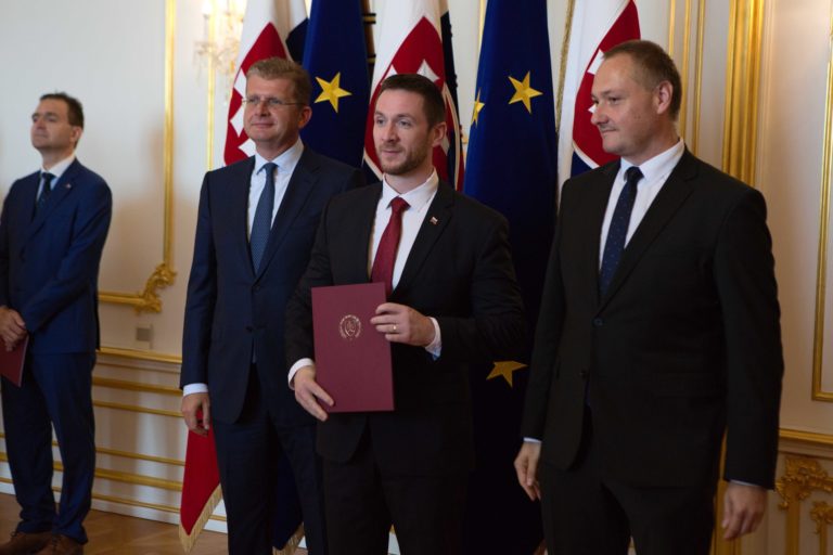 Zľava: Zvolení europoslanci za Progresívne Slovensko Ľudovít Ódor a za Republiku Milan Uhrík a podpredseda parlamentu Peter Žiga počas odovzdávania osvedčení o zvolení novým poslancom Európskeho parlamentu na Bratislavskom hrade. Bratislava, 18. jún 2024. Foto: SITA/Tomáš Susko