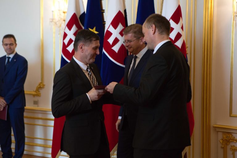 Sprava: Podpredseda parlamentu, poverený vedením predsedu NR SR Peter Žiga a predseda Štátnej komisie pre voľby a kontrolu financovania politických strán Eduard Burda počas odovzdávania osvedčení o zvolení novým poslancom Európskeho parlamentu na Bratislavskom hrade. Bratislava, 18. jún 2024. Foto: SITA/Tomáš Susko