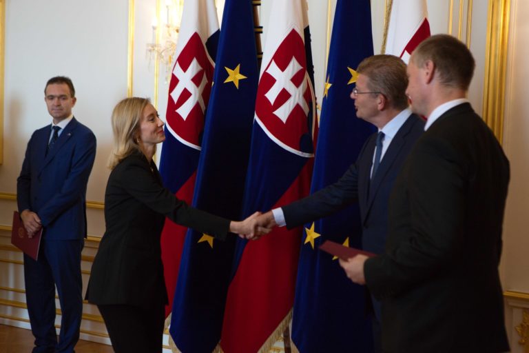 Zľava: Podpredseda parlamentu Peter Žiga, europoslankyňa za Progresívne Slovensko Veronika Cifrová Ostrihoňová a predseda Štátnej komisie pre voľby a kontrolu financovania politických strán Eduard Burda počas odovzdávania osvedčení o zvolení novým poslancom Európskeho parlamentu na Bratislavskom hrade. Bratislava, 18. jún 2024. Foto: SITA/Tomáš Susko