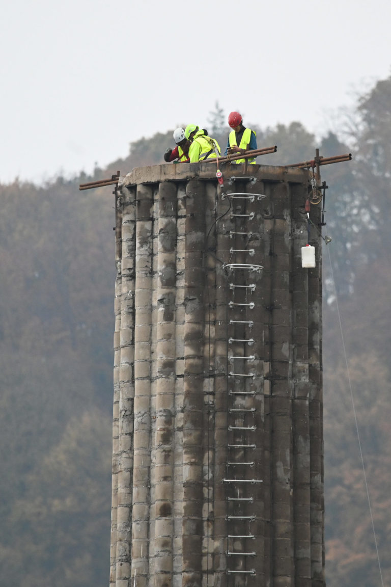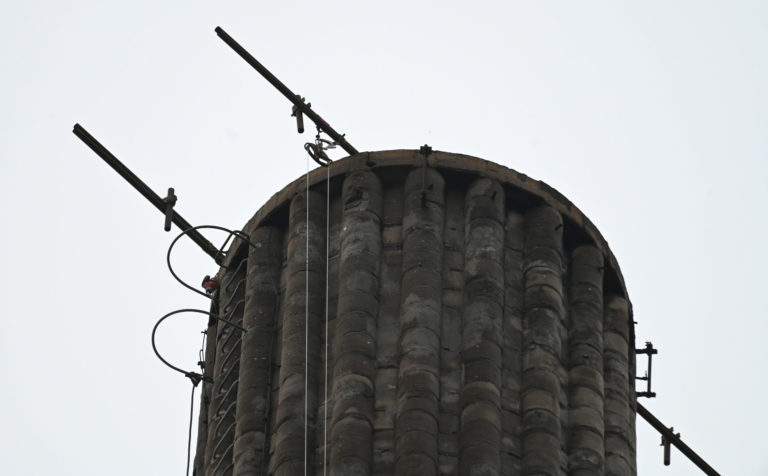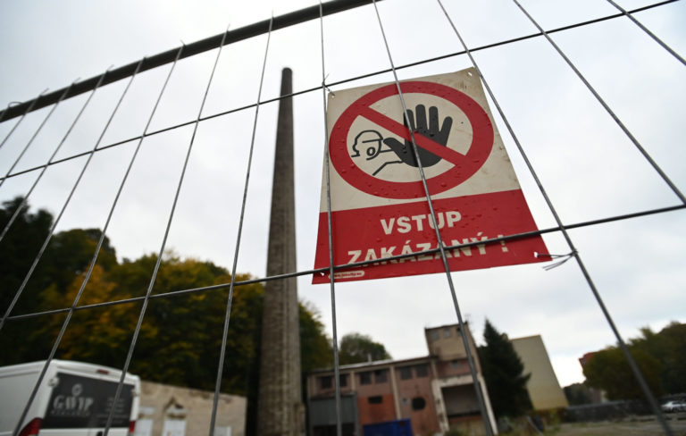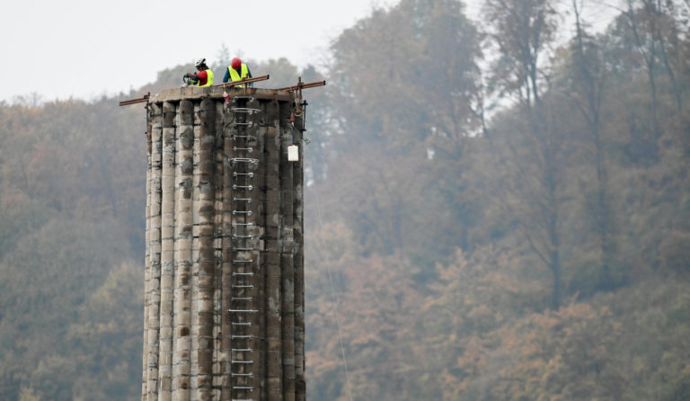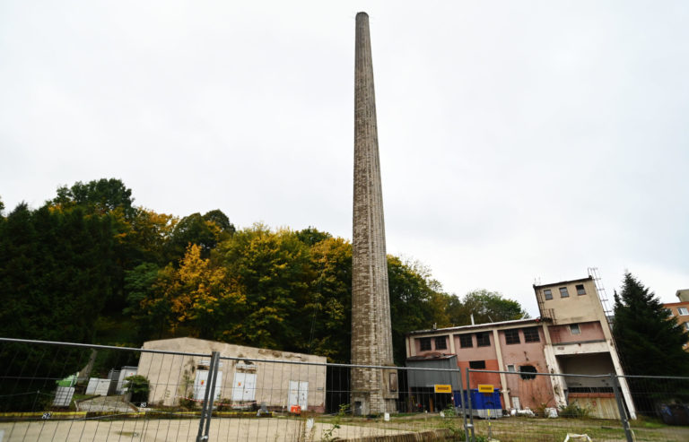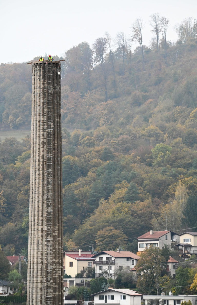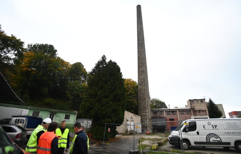 Robotníci začínajú s odstraňovaním 80 metrov vysokého kúpeľného komína v širšom centre mesta Trenčianske Teplice. Búracie práce prebehnú s odhadovanou dobou rozoberania približne 90 dní. Trenčianske Teplice, 25. október 2023. Foto: SITA/Tomáš Somr