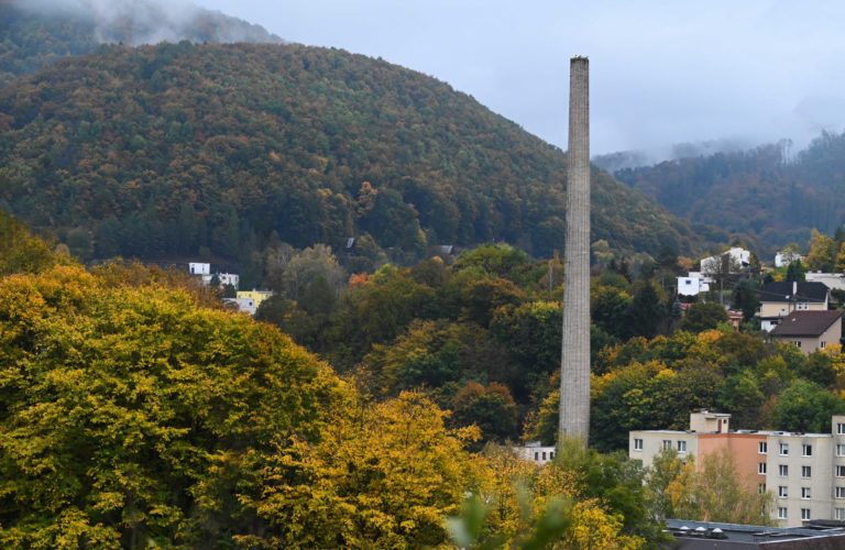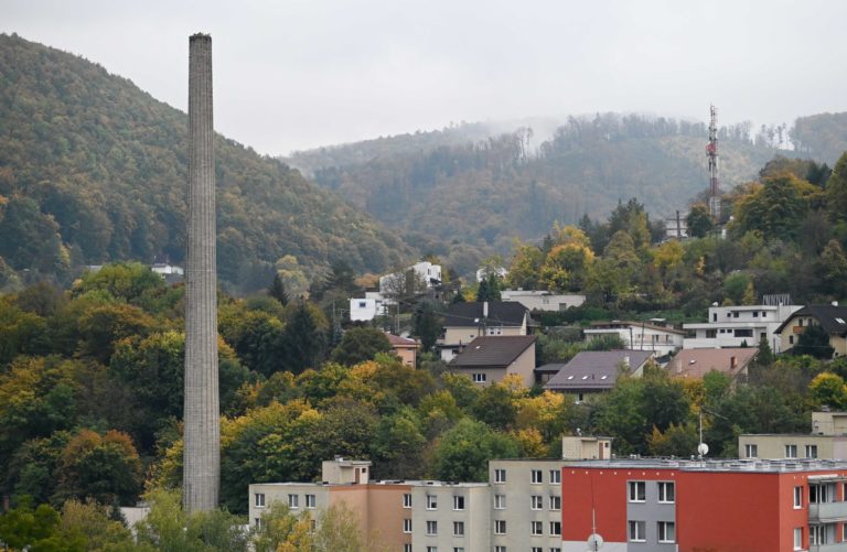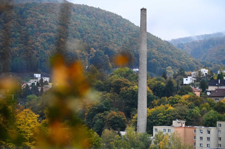 Pohľad na najvyššiu časť 80 metrov vysokého kúpeľného komína v širšom centre mesta Trenčianske Teplice. Búracie práce prebehnú s odhadovanou dobou rozoberania približne 90 dní. Trenčianske Teplice, 25. október 2023. Foto: SITA/Tomáš Somr