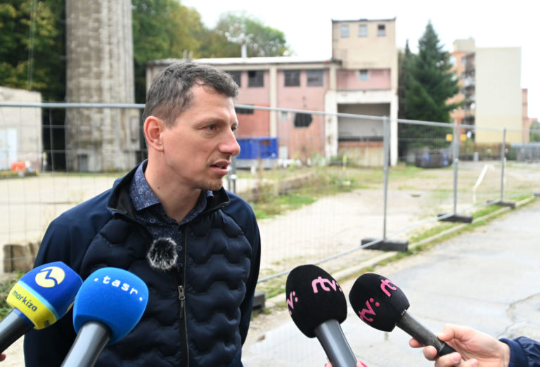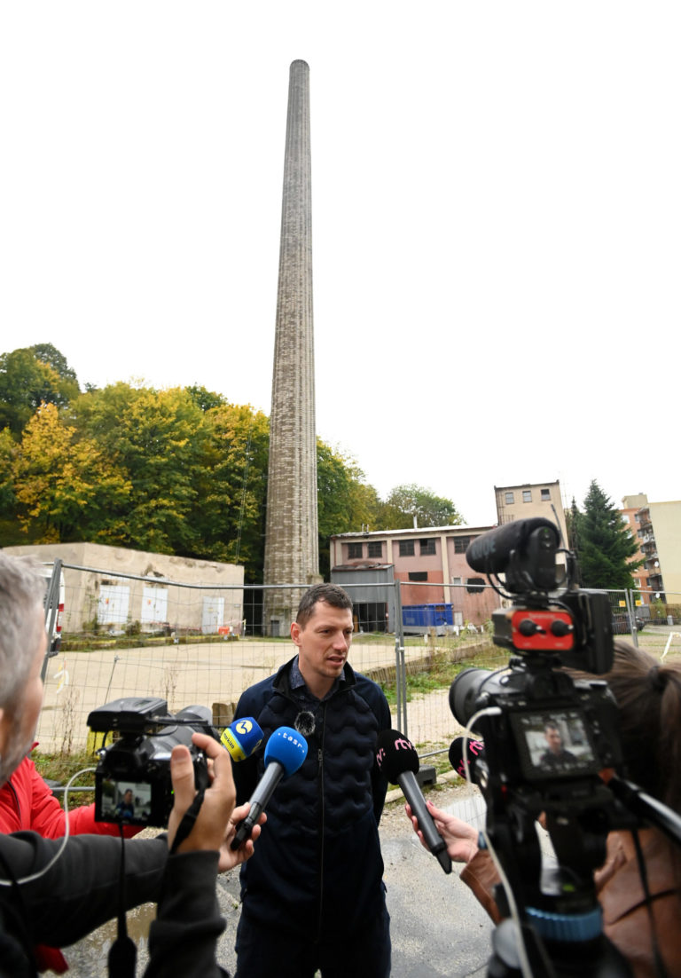 Technický riaditeľ Kúpeľov Trenčianske Teplice Martin Matuščin v rozhovore s novinármi o odstraňovaní 80 metrov vysokého kúpeľného komína v širšom centre mesta Trenčianske Teplice. Búracie práce prebehnú s odhadovanou dobou rozoberania približne 90 dní. Trenčianske Teplice, 25. október 2023. Foto: SITA/Tomáš Somr