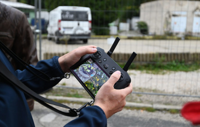 Pohľad na obrazovku dronu, ktorý zaznamenáva odstraňovanie 80 metrov vysokého kúpeľného komína v širšom centre mesta Trenčianske Teplice. Búracie práce prebehnú s odhadovanou dobou rozoberania približne 90 dní. Trenčianske Teplice, 25. október 2023. Foto: SITA/Tomáš Somr