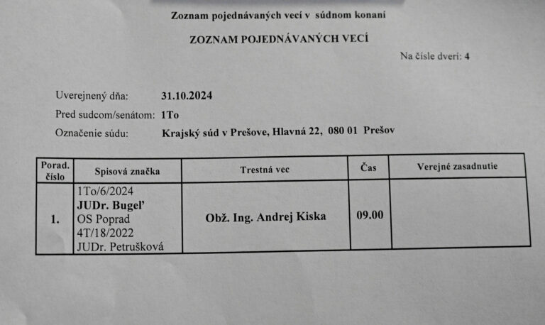 Výveska pred verejným zasadnutím s exprezidentom Andrejom Kiskom a Eduardom Kučkovským k rozhodnutiu odvolania obžalovaných aj prokurátora v daňovej kauze spoločnosti KTAG na Krajskom súde Prešov. Prešov 31. október 2024. Foto: SITA/Viktor Zamborský