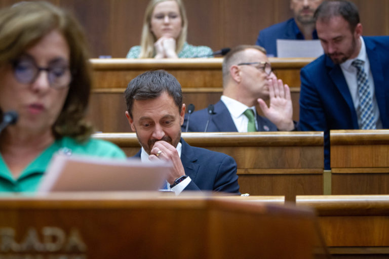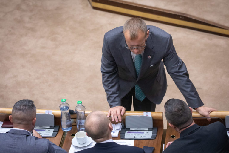 Predseda vlády Eduard Heger (vpravo v popredí) počas rokovania mimoriadnej 73. schôdze Národnej rady SR o návrhu skupiny poslancov NR SR na vyslovenie nedôvery podpredsedovi vlády a ministrovi financií SR Igorovi Matovičovi. Bratislava, 28. september 2022. Foto: SITA/Diana Černáková