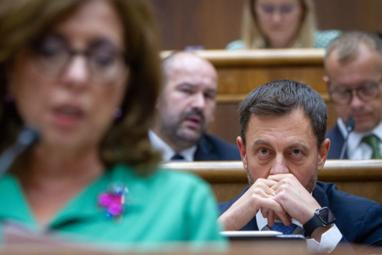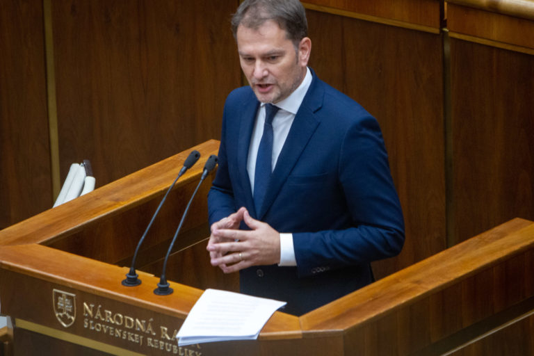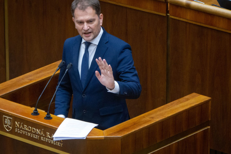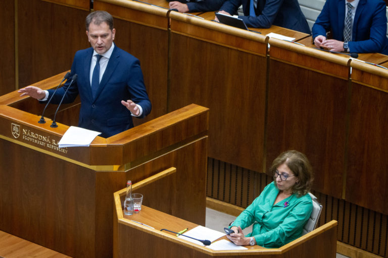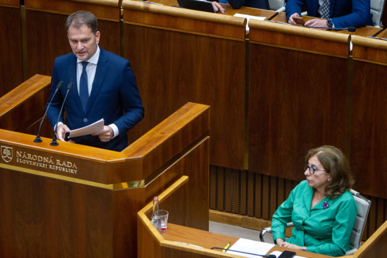 Predseda vlády Eduard Heger počas rokovania mimoriadnej 73. schôdze Národnej rady SR o návrhu skupiny poslancov NR SR na vyslovenie nedôvery podpredsedovi vlády a ministrovi financií SR Igorovi Matovičovi. Bratislava, 28. september 2022. Foto: SITA/Diana Černáková