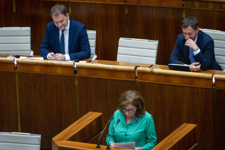Zľava: Predsedníčka poslaneckého klubu strany Sloboda a Solidarita (SaS) Anna Zemanová a predseda vlády Eduard Heger počas rokovania mimoriadnej 73. schôdze Národnej rady SR o návrhu skupiny poslancov NR SR na vyslovenie nedôvery podpredsedovi vlády a ministrovi financií SR Igorovi Matovičovi. Bratislava, 28. september 2022. Foto: SITA/Diana Černáková