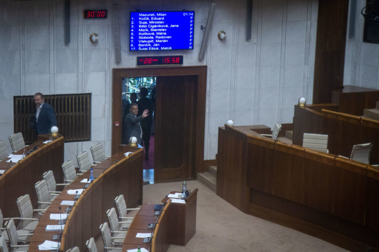 Odchod poslancov po prejave podpredsedu vlády a ministra financií SR Igora Matoviča počas rokovania mimoriadnej 73. schôdze Národnej rady SR o návrhu skupiny poslancov NR SR na vyslovenie nedôvery podpredsedovi vlády a ministrovi financií SR Igorovi Matovičovi. Bratislava, 28. september 2022. Foto: SITA/Diana Černáková