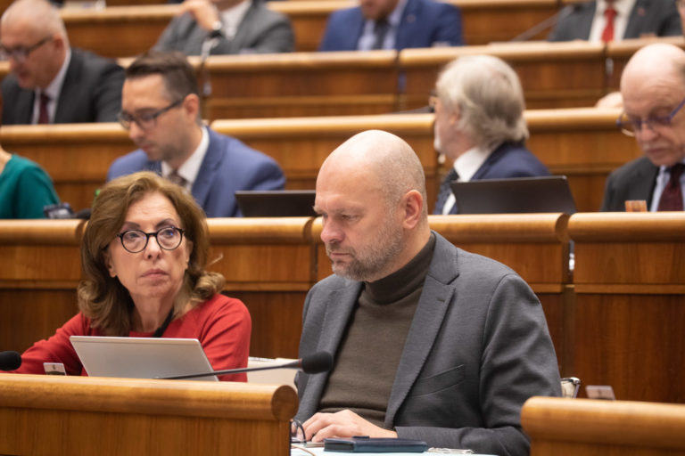 Zľava: Poslanci NR SR za stranu Sloboda a Solidarita (SaS) Richard Sulík a Anna Zemanová počas rokovania mimoriadnej 73. schôdze Národnej rady SR o návrhu skupiny poslancov NR SR na vyslovenie nedôvery podpredsedovi vlády a ministrovi financií SR Igorovi Matovičovi. Bratislava, 28. september 2022. Foto: SITA/Diana Černáková