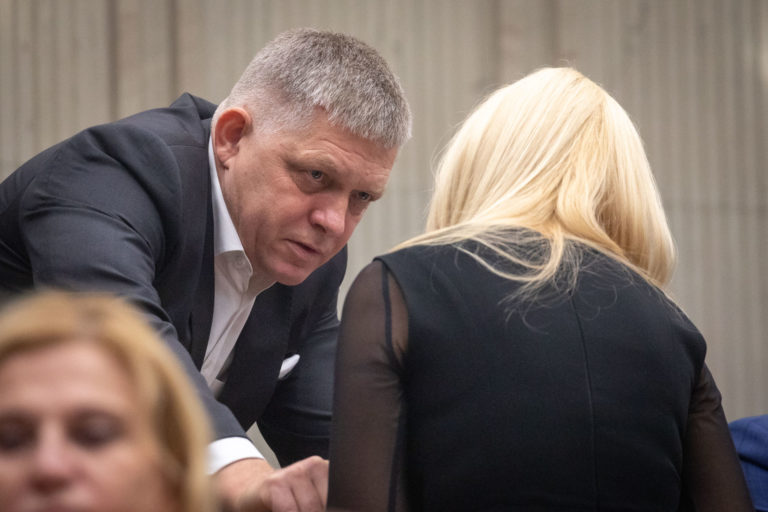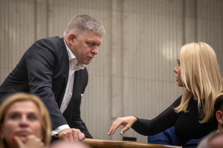 Zľava: Poslanec NR SR za stranu Smer-SD Robert Fico a nezaradená poslankyňa NR SR Denisa Saková počas hlasovania o návrhu skupiny poslancov NR SR na vyslovenie nedôvery podpredsedovi vlády a ministrovi financií SR Igorovi Matovičovi. Bratislava, 4. október 2022. Foto: SITA/Diana Černáková