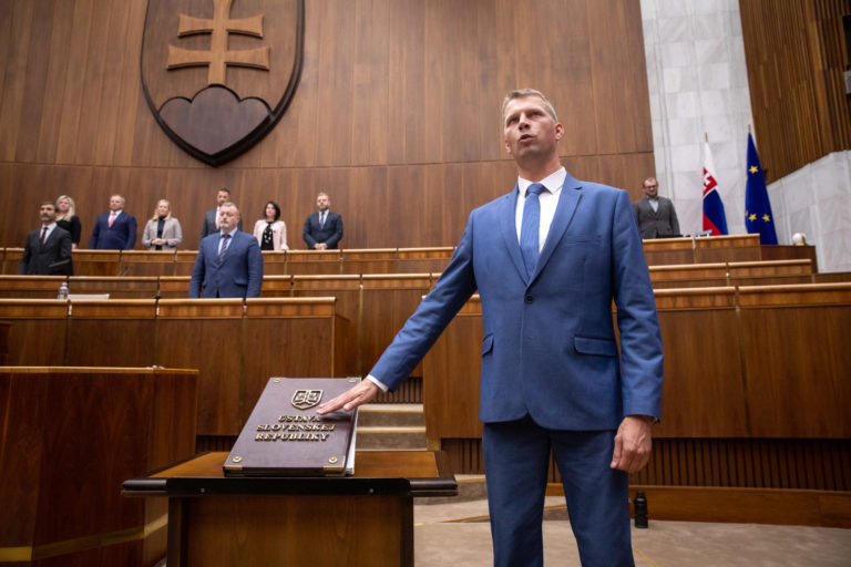Poslanec NR SR za hnutie Obyčajní ľudia a nezávislé osobnosti (OĽaNO) Peter Cseh skladá sľub počas rokovania 72. schôdze Národnej rady SR. Bratislava, 4. október 2022. Foto: SITA/Diana Černáková